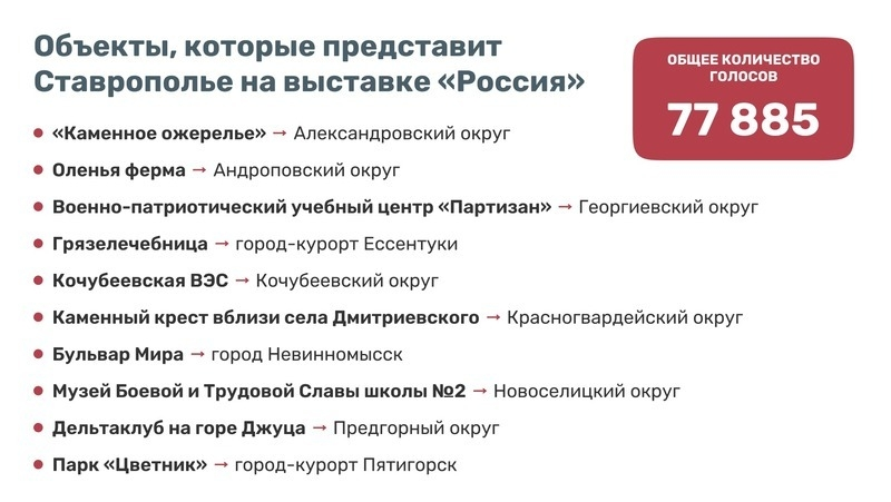Во время первого этапа голосования были отобраны лидеры в каждом округе. На втором — жители региона определили лучших в крае. Таким образом, Ставрополье на международной выставке «Россия», которая пройдёт в Москве в ноябре 2023 года, представят 10 объектов-лидеров. В Кочубеевском округе победителем стала ветроэлектростанция. Полный список лидеров — в инфографике.